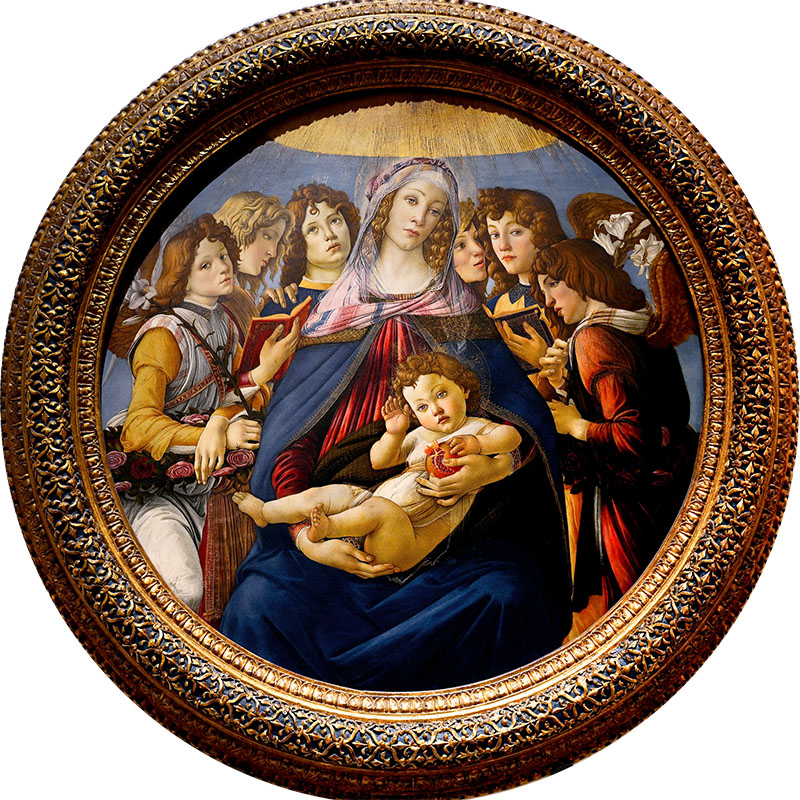 The Madonna and Child are often featured in Renaissance altarpieces, particularly those shaped as a lunette, a rectangular form with a domed top. Mary is also depicted in the circular “tondo” form. According to one theory, both of these shapes symbolize Mary’s innocence, wisdom, and perfection, since the circle is a shape that represents wholeness.