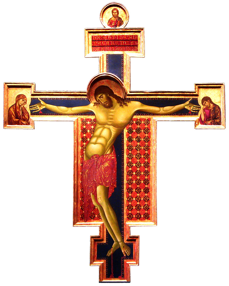 One of the earliest examples is the Franciscan crucifix called the Christus triumphans or Triumphant Cross in which Christ is pictured upright and victorious, overcoming death. There is also the Christus patiens or Sorrowful Christ in which Jesus’ body is bent and his head droops with eyes closed.